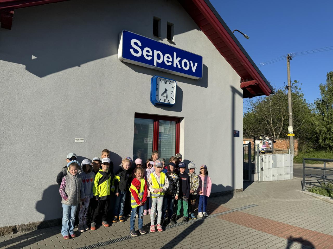 Posilněni koblížkem jsme se ze sepekovského nádraží vydali do školky-cestou jsme se protáhli na hřišti, pozorovali pana Sedláčka, jak pečuje o malé stromečky a mohli se posadit do traktoru.