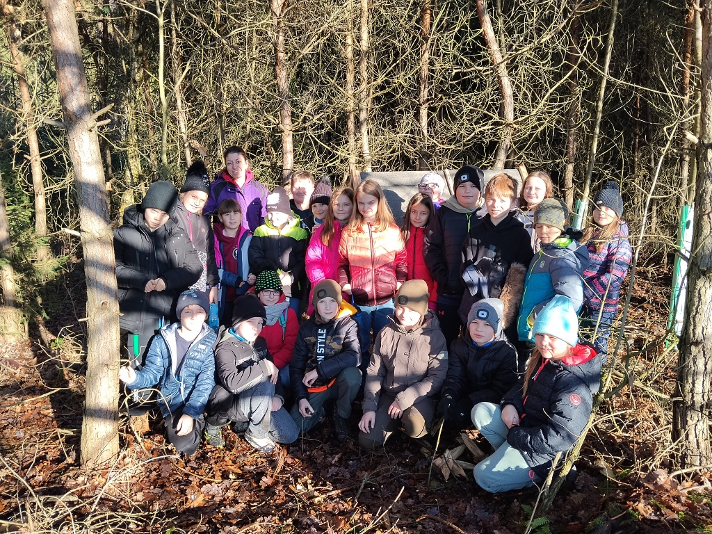 Poté jsme se vydali ke krmelci v lese Borek, kde nám kluci ukázali, jak se zakrmuje a co vše patří k péči o zvěř v zimě. Nakonec jsme ještě věnovali chvíli rostlinám a neživé přírodě a zaplnili alfabox přírodninami. I když jsme byli trochu od bláta, učení venku se nám moc líbilo.